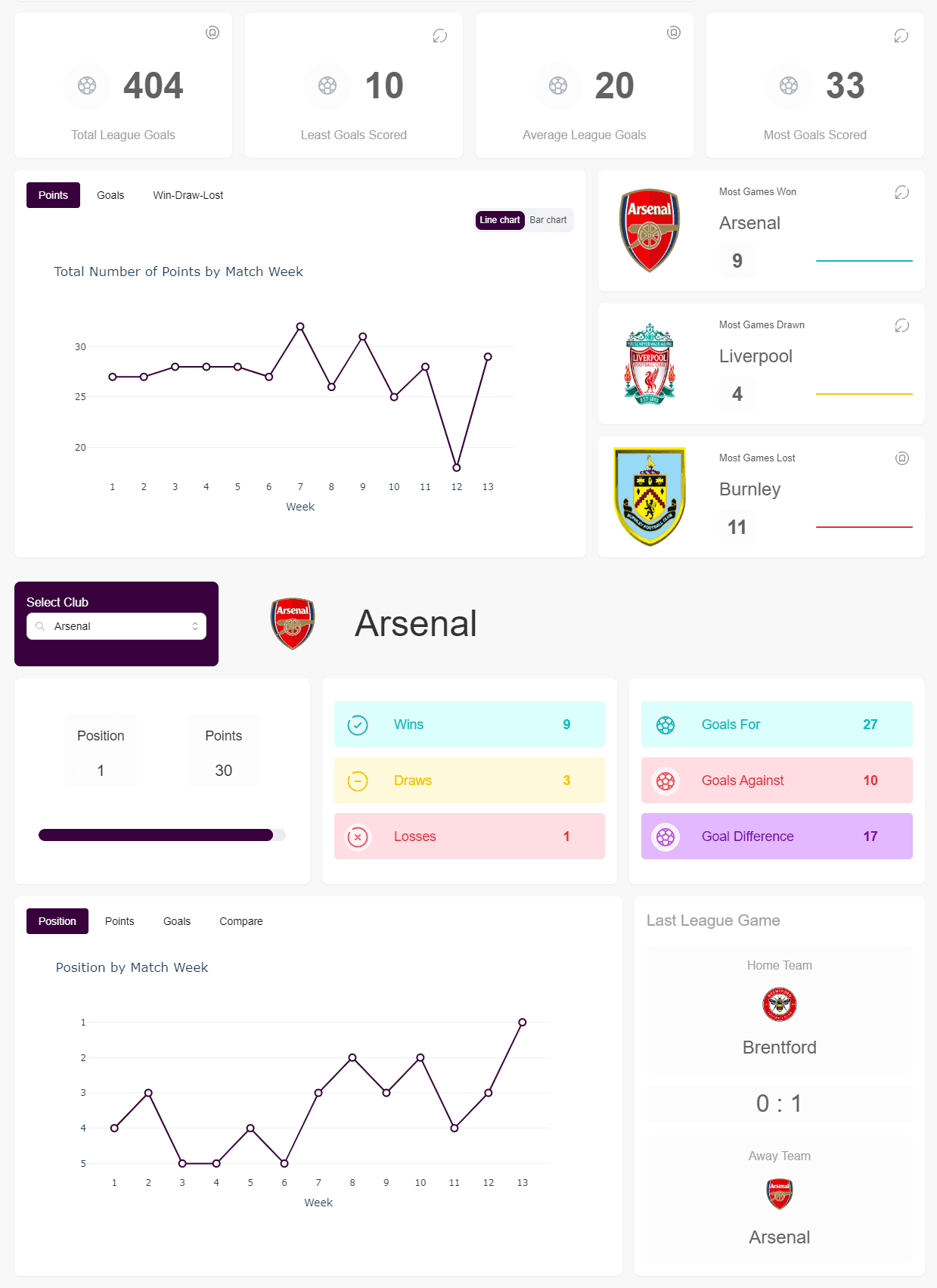 Creating an informatiove and interactive dashboard of the 2023/2024 league season for diffferent european football leagues.